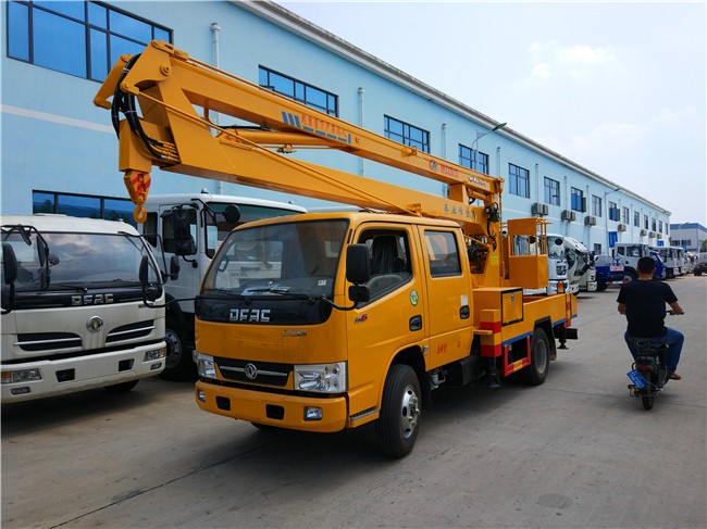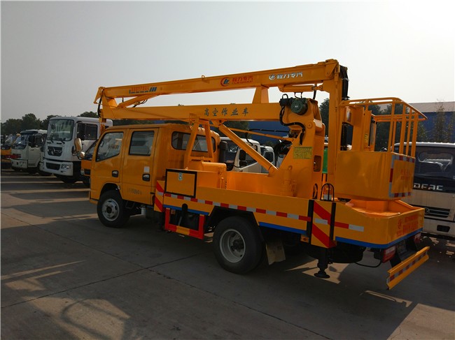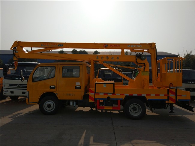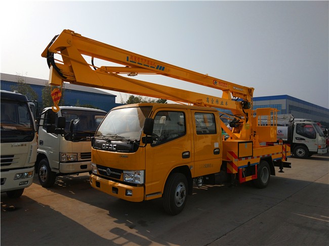 东风凯普特12米14米16米高空作业车采用折叠式曲臂结构,作业臂12米为两节折叠式14米16米为三节折叠式,工作斗和转台双工作位,上下操作,液压手动控制,可360度回转,四液压支腿,带1吨吊钩,工作斗大承重200公斤,钢制工具箱及围板、花纹防滑走台板。